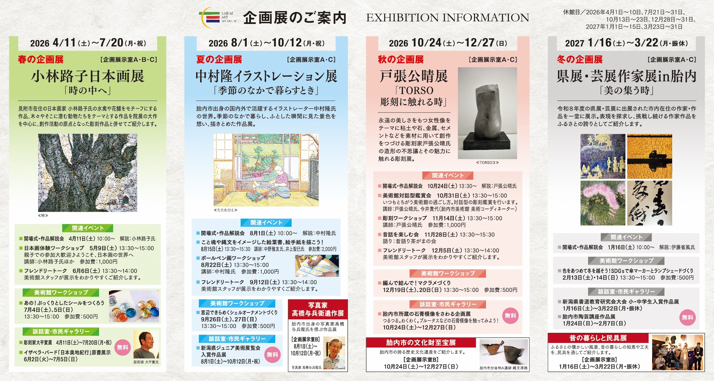 【お問合せ】☎0254(47)2288/tainaiartmuseum@city.tainai.lg.jp/胎内市美術館
